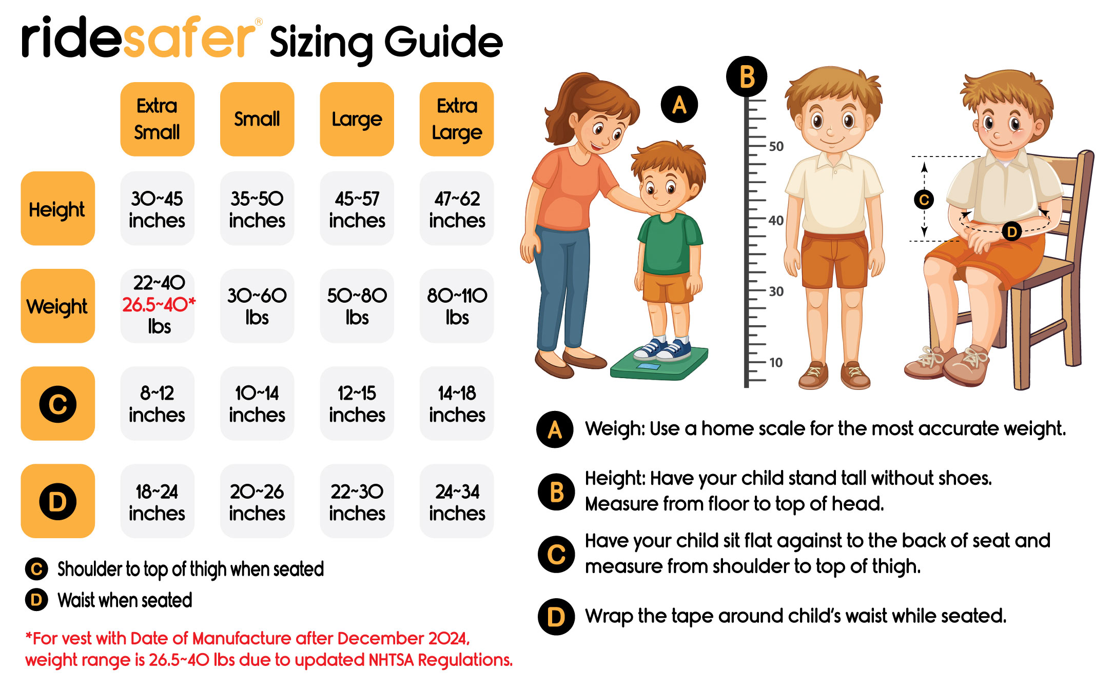 RideSafer Interactive Sizing Tool Child's Age (years): Weight (lbs): Height (inches): Shoulder to Top of Thigh When Seated (inches): Waist When Seated (inches): Calculate Size